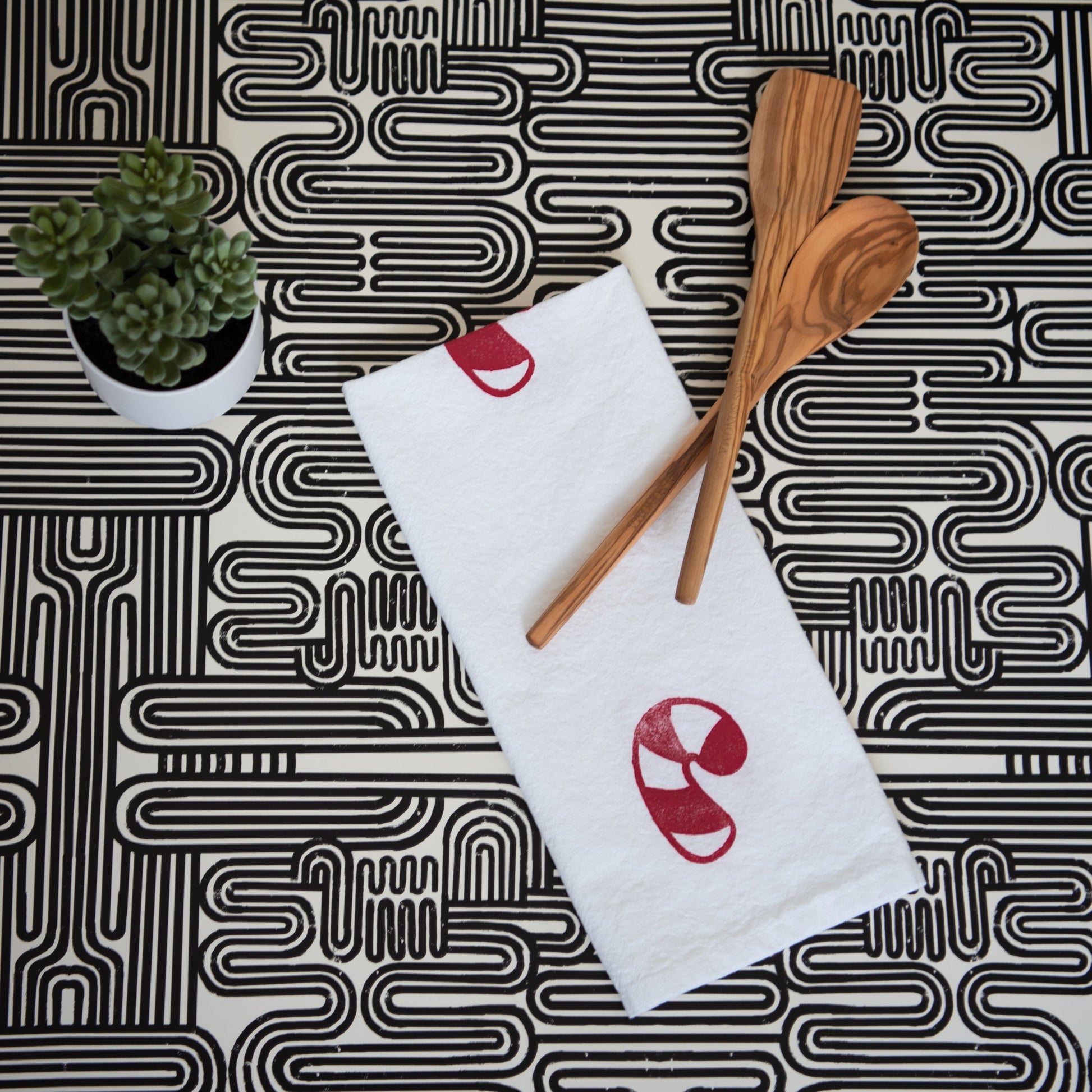 Get into the holiday spirit with this festive block-printed candy cane kitchen towel! The candy cane design is carefully hand-carved and then stamped onto a durable flour sack towel, adding a touch of holiday cheer to your kitchen. Whether you're drying dishes or decorating for the season, this towel is a fun and functional addition to your home. Perfect for gift-giving or brightening up your holiday decor.