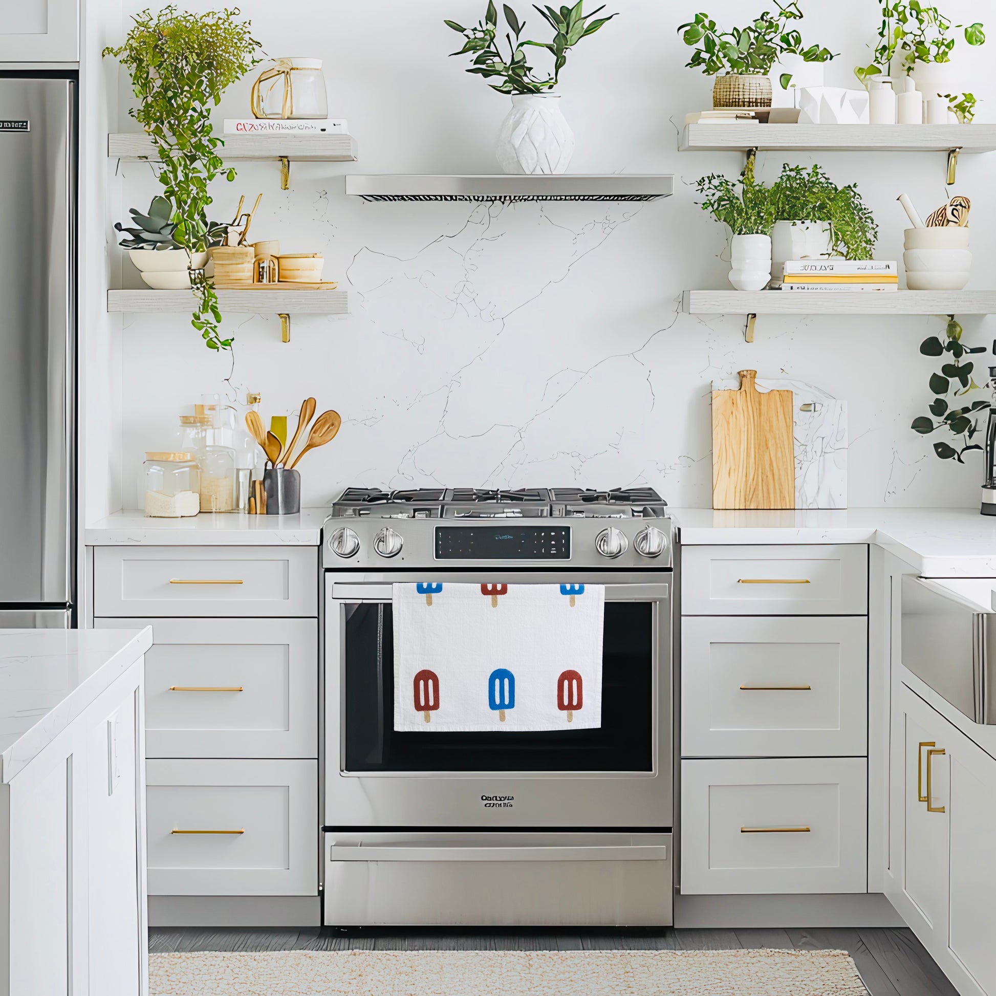 Bring summer vibes to your kitchen with this colorful hand-printed popsicles towel! Featuring a fun popsicle design from a handmade stamp, this towel is perfect for adding a playful touch to your kitchen decor. Made from durable 100% cotton flour sack material, it's highly absorbent and great for everyday use. Whether you're drying dishes or serving snacks, this towel is sure to brighten your day.