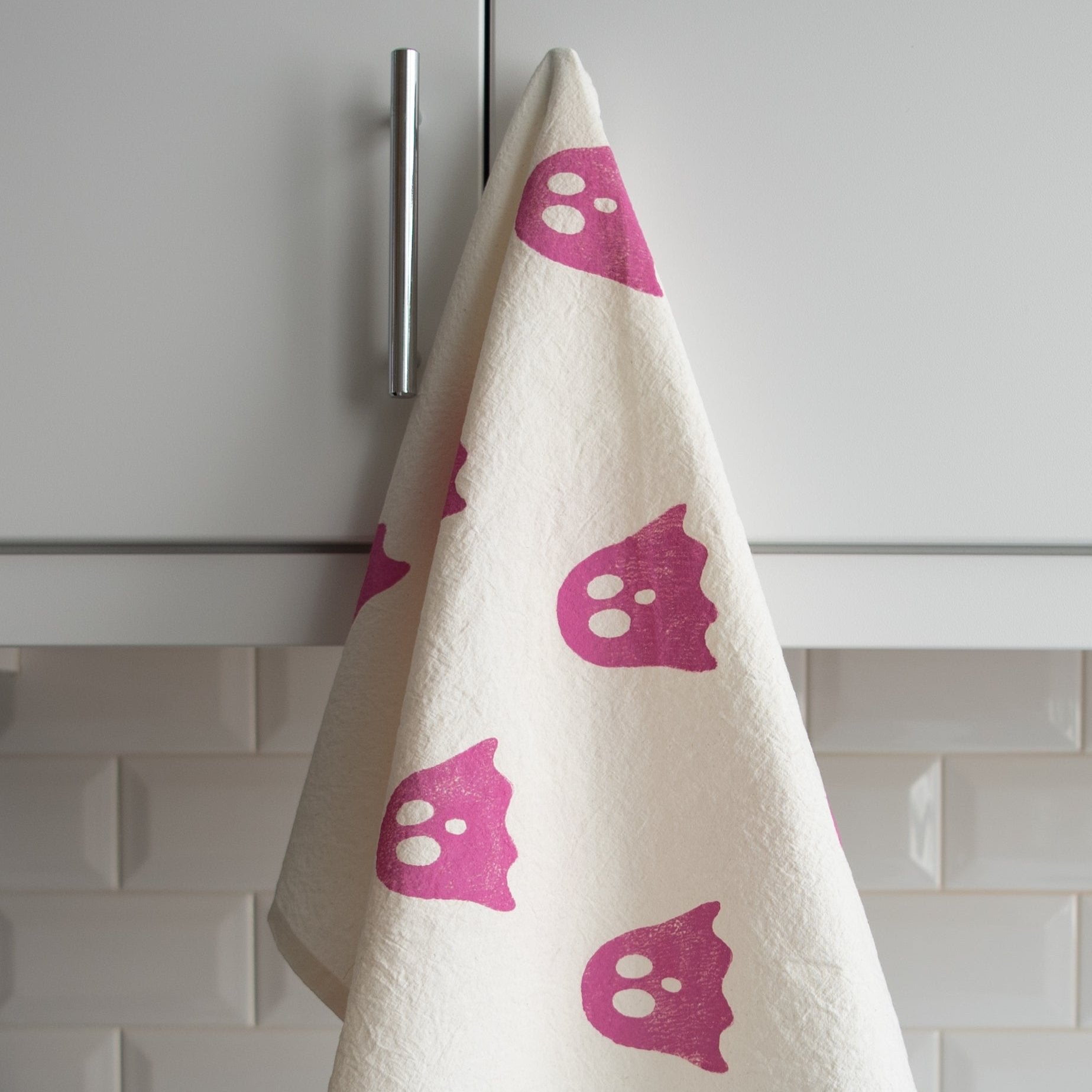 Block-Printed Ghosts Flour Sack Kitchen Towel - Pink