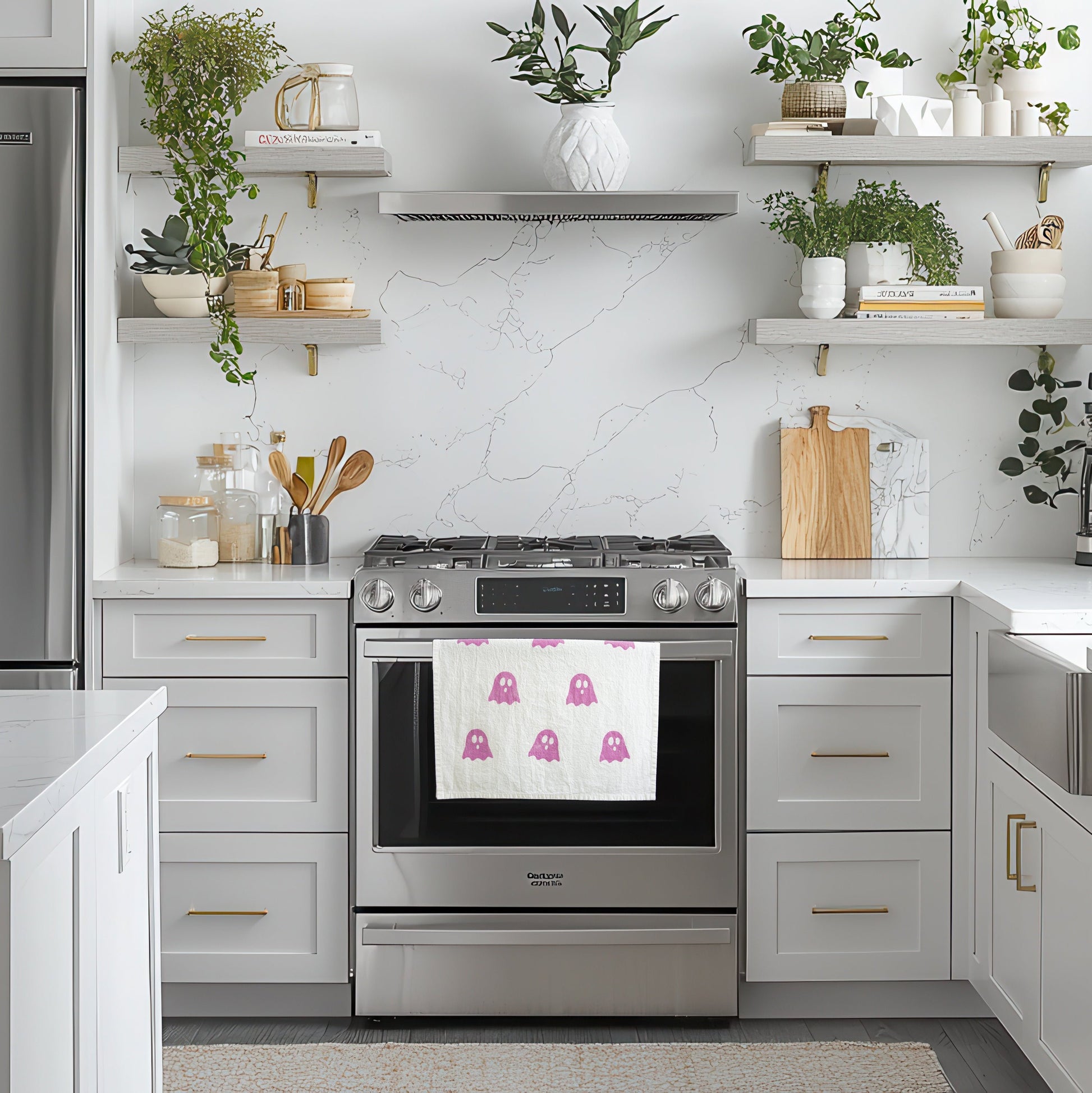 Spook up your kitchen decor with this hand-printed ghost-themed kitchen towel! Featuring cute, playful ghosts, this towel is perfect for Halloween or adding a whimsical touch year-round. Handmade with love, this 100% cotton flour sack towel is highly absorbent and durable for everyday use. It's a fun and functional way to bring a little spooky joy into your home.